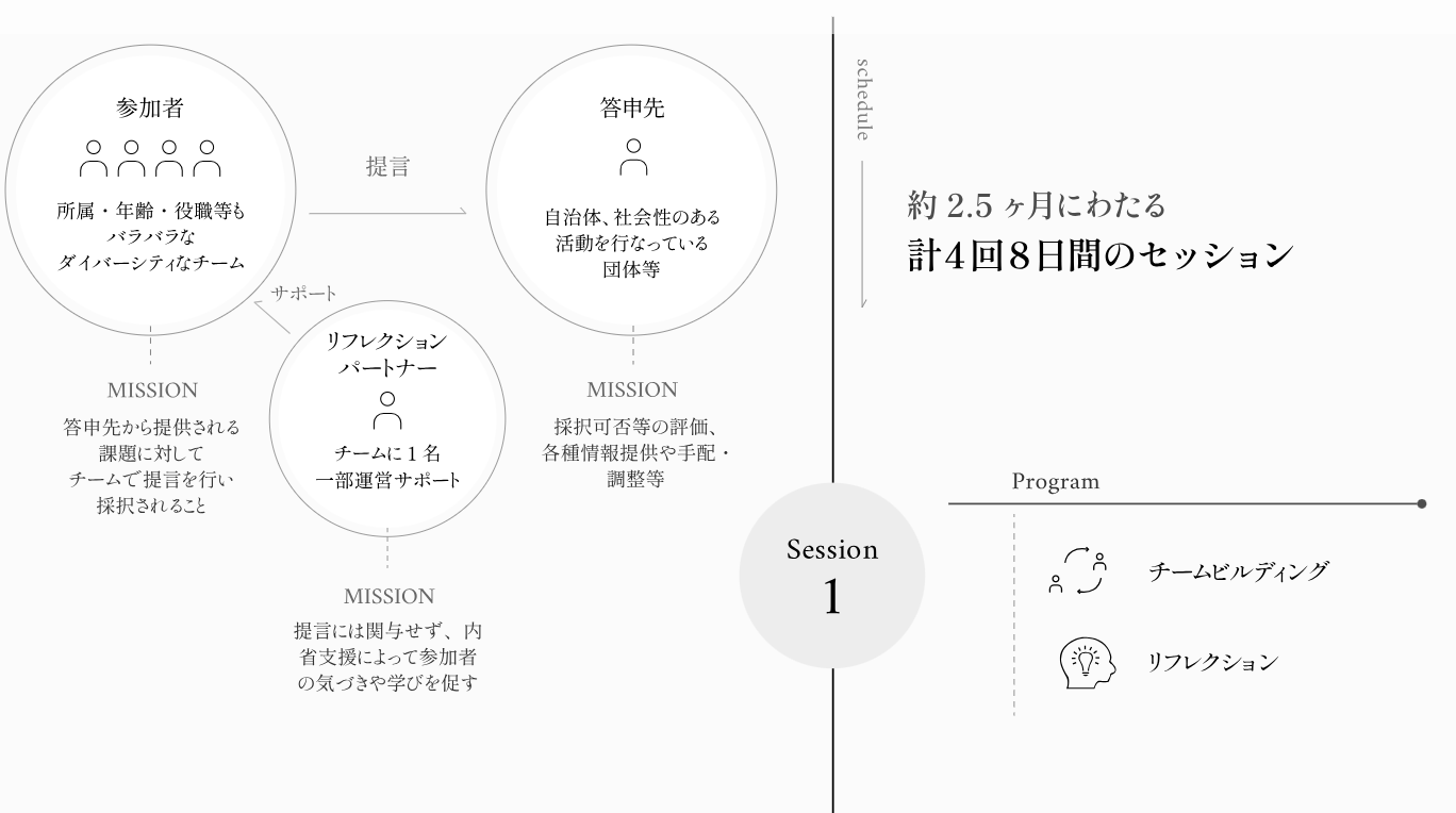 様々な企業から参加者が集まり、答申先の行政職員とともに、全4回8⽇間のセッションで、参加メンバー力を合わせてチームビルディングから課題に対するソリューション開発と提案までを⾏う『DAISプロジェクト事業』。